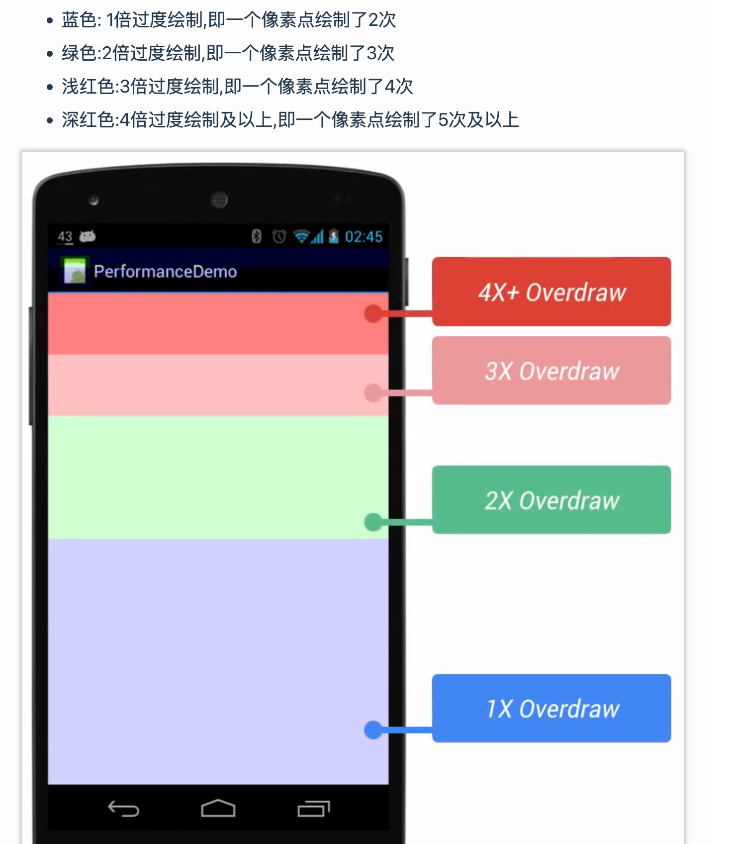 使用手机开发者选项里show view overdraw 功能监测app页面里布局是否过度绘制,按照颜色可知是否绘制了多次,结合layout inspector 分析布局层级进行优化。